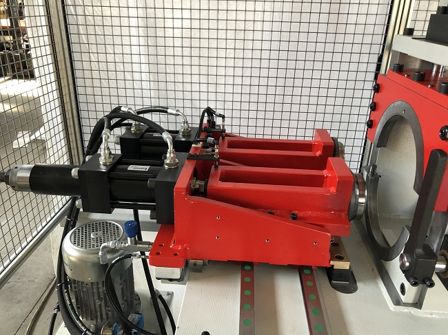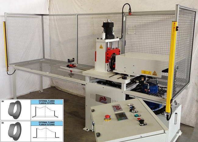 Flanging machine for pipes with double mobile head. Unlike standard trimming and beading machines, flanging process in MFO machines doesn't require any spindle or part rotation.